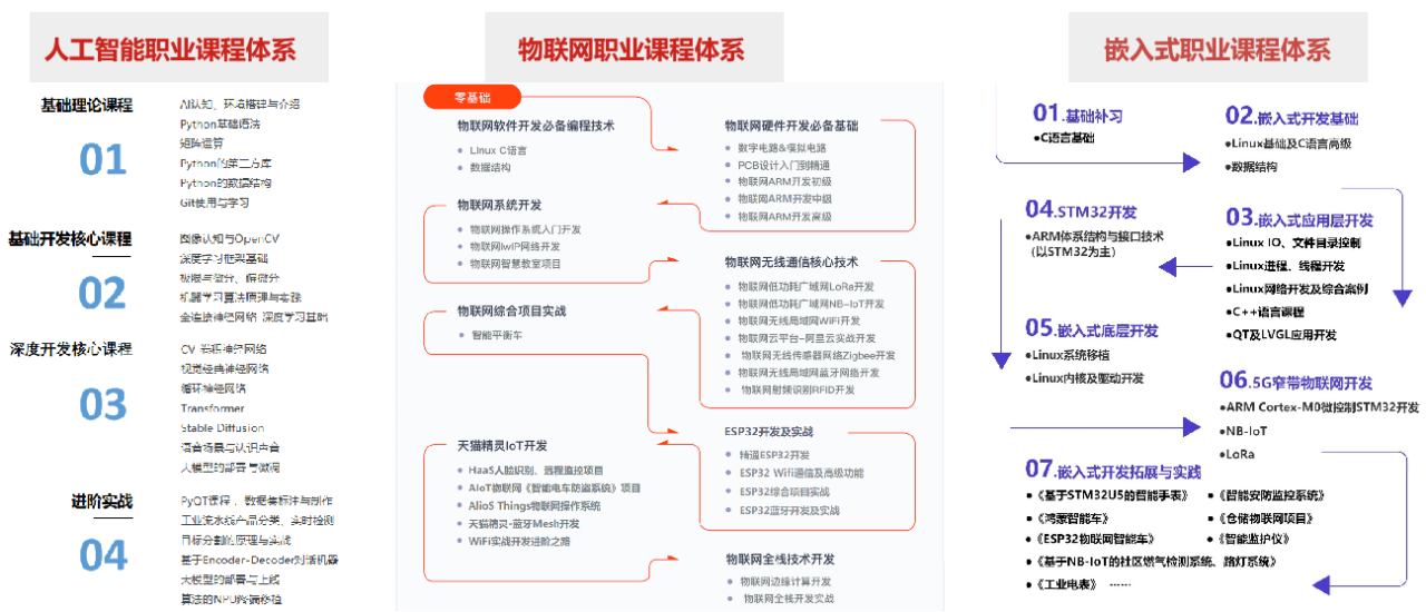嵌入式、人工智能、物联网成为智能时代三大主流技术体系,从基础到进阶,结合创新的软硬件教学平台及企业落地实战项目,锻造符合时代发展的高质量人才。全国13大校区严选200多位业内资深讲师,线上线下同步授课,全方位将学员培养成为符合当下企业需要的高质量复合型人才。