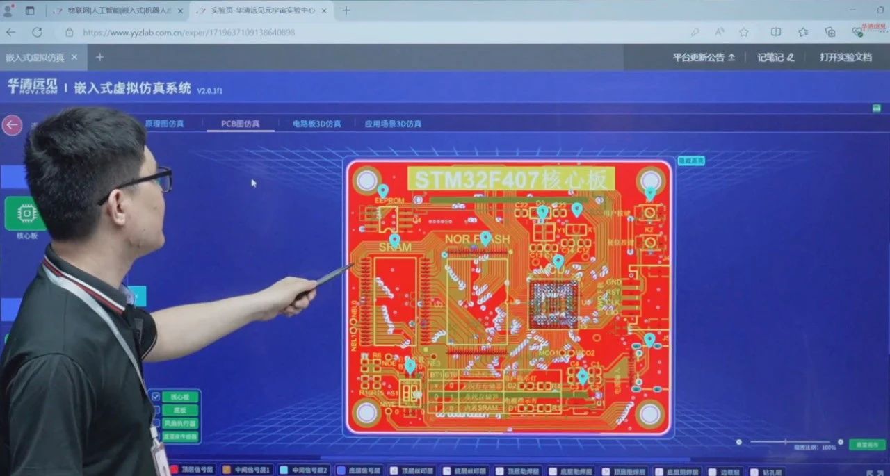华清远见元宇宙嵌入式虚拟仿真在线教学平台,具有丰富完善的平台仿真功能,支持知识点项目管理、处理器内核相关功能仿真、外设控制器仿真、原理图应用仿真、PCB各层线路仿真、3D电路板仿真、3D场景仿真、流程图编程仿真、STM32CubeMXHAL库源码仿真;支持FreeRTOS、RT-Thread等RTOS;支持LVGL等UI,覆盖整个嵌入式体系化教学。