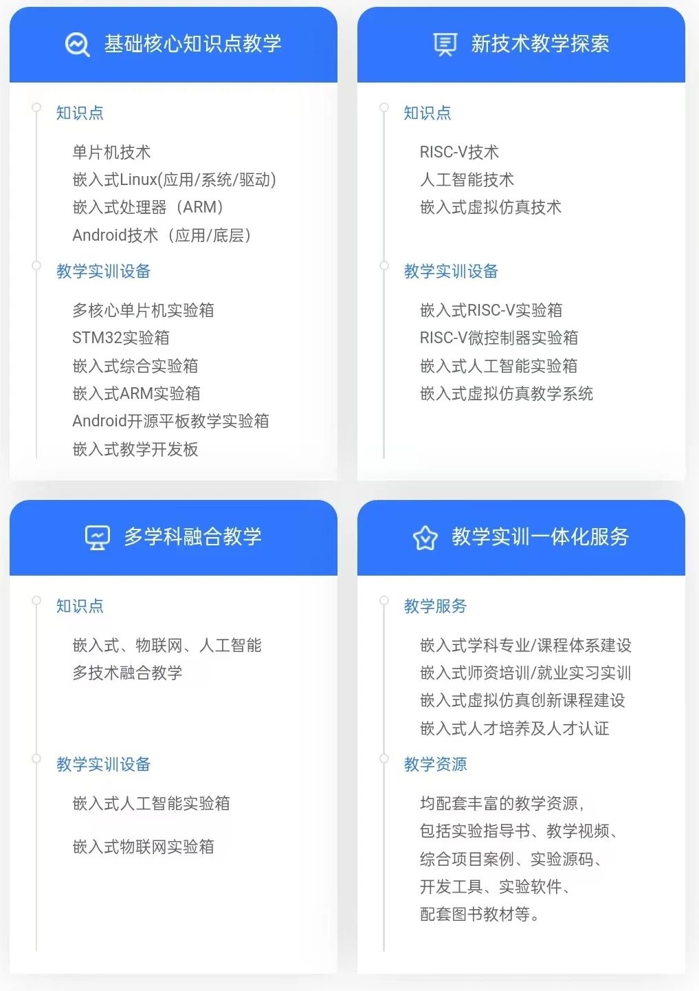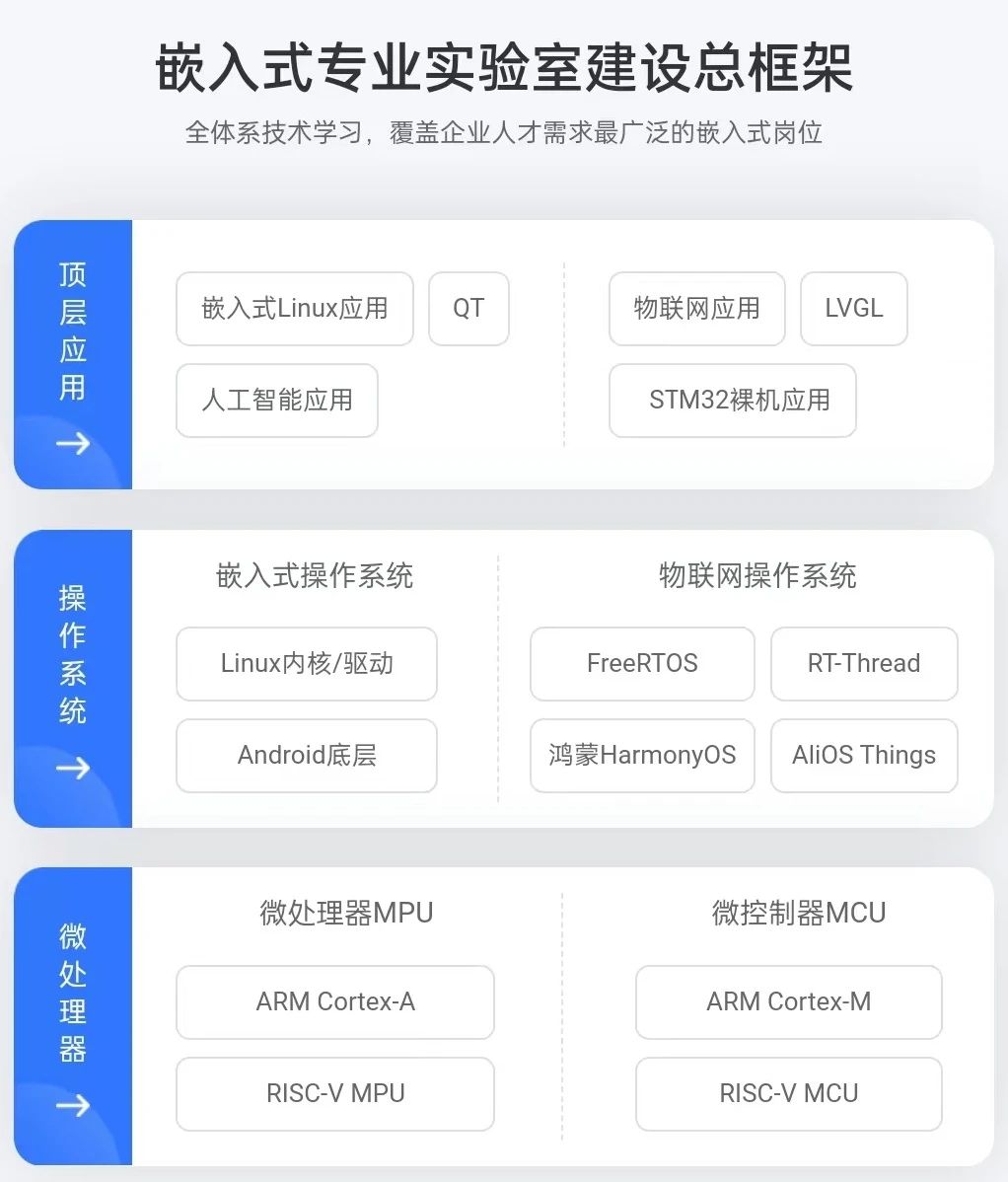 除培训课程中展示的虚拟仿真软件平台,华清远见还研发了一系列硬件平台,通过一系列软硬件教学实训平台,为高校提供专业的嵌入式实验室解决方案。整体实验室建设面向企业需求,提供全体系技术的教学软硬件设备,覆盖企业人才需要最广泛的嵌入式岗位。