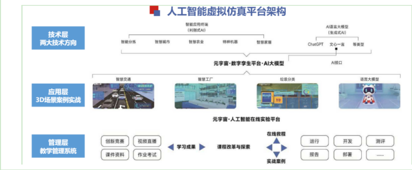人工智能高端人才实战班还使用了华清远见自研教学平台——人工智能虚拟仿真平台。人工智能虚拟仿真平台是华清远见为解决多年的人工智能学科建设及人才培养的过程中几大难点问题应运而生的软件教学平台。独家首创的积木式搭建人工智能学习架构,可视化理解人工智能算法,配以专业课程、实践项目、动态代码资源包和可以迁移学习的3D产业场景,能够快速准确帮助学生构建整体人工智能学习思维并可进行自主学习和创新实验和成果展示。