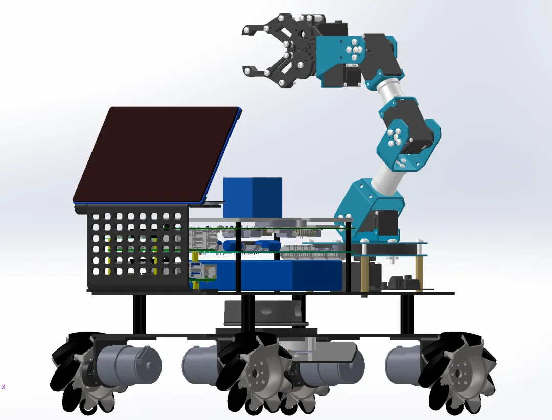 3.轮式车辆:这是一款基于ROS系统的高性能智能移动机器人平台,集成了激光雷达与麦克纳姆轮全向移动系统,具备自主建图、实时避障与精准导航能力。机器人搭载六自由度机械臂,配备双目视觉系统,可实现目标识别、距离测量与动态跟踪。通过运动学正逆解算法与PID控制策略,机械臂能够完成对目标物体的自主抓取与精确操作,具有高稳定性、高精度与良好的实时响应性能,展现了在服务机器人、工业自动化等领域的广泛应用前景。