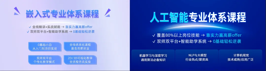 阶梯式学习路径,嵌入式体系课从原理解析到硬件实操再到综合项,逐层夯实 “底层逻辑 + 工程实践” 能力,培养具备全链路执行能力的研发型技术人才;人工智能体系课实战全栈项目,聚焦 “数据采集 - 模型训练 - 硬件部署” 全流程,培养跨领域协作与系统级开发思维,塑造掌握全流程技术的算法型创新人才。