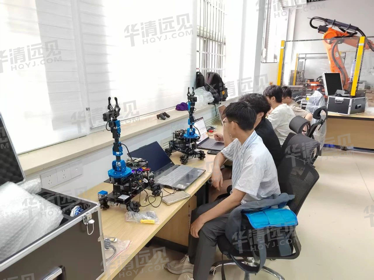 华清远见研发工程师对人工智能教学实验平台及人工智能机器人开发套件的使用及实验操作进行相关培训。