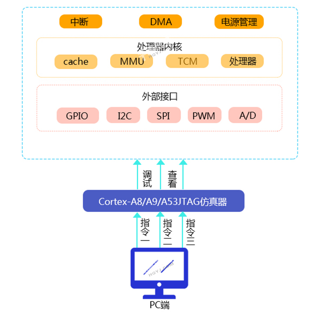 比如对于嵌入式处理器工作原理的理解不了,就会增加嵌入式学习的难度,而针对这一问题,我们自主研发的Cortex-A8/A9/A53 JTAG仿真器,仿真器把PC端编译好的程序指令传送到嵌入式系统里的RAM里,并控制CPU运行相关程序,实现程序的全速、单步运行、断点设置(程序运行后让程序停在需要调试的位置)。并可以通过PC端配套的软件进行现象查看或者调试,可及时查找问题。同时也可查看CPU内部寄存器、内存、外设控制器的实时状态