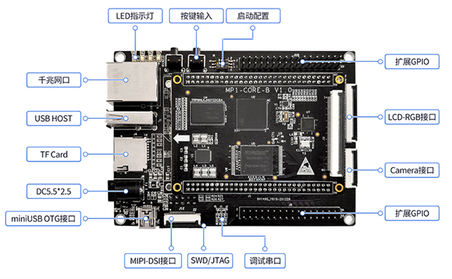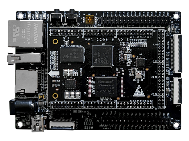 FS-MP1D工控板尺寸为105mm*75mm*19.5mm,硬件接口主要包括千兆以太网、 USB HOST 接口、miniUSB OTG 接口、Micro SD卡槽接口、RGB 接口、MIPI-DSI 接口、DVP 摄像头接口、LED 指示灯、SWD/JTAG 调试端口、UART 调试端口、扩展接口等。FS-MP1D工控板支持5寸MIPI电容屏、7寸RGB 电容屏、300万摄像头、500万摄像头、SWD 仿真器(调试 Cortex-A7/Cortex-M4 内核)等多种配件,能够帮助用户快速实现平台开发与项目验证。
