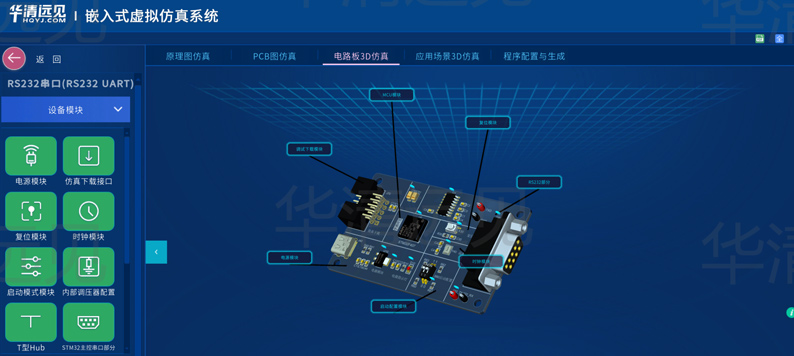 注:本部分实验包含:原理图接线、PCB图生成、3D器件及电路板生成、 流程图配置、3D场景硬件模块接线、代码生成与外部程序仿真